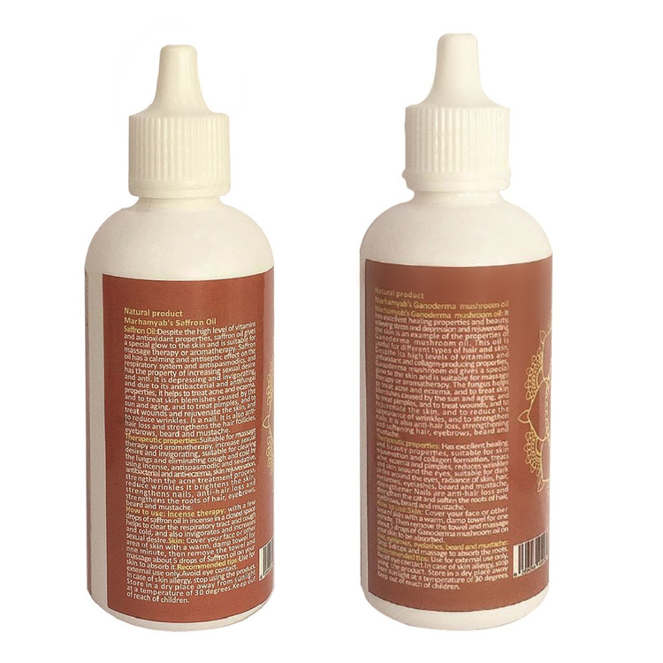 روغن زعفران و گانودرما شامل آهن ، منگنز، مس، منیزیم ، فسفر و ویتامین B6 میشود. علاوه بر این برگها و دانههای این گیاهان دارای خواص ضدمیکروبی ، آنتی اکسیدانی، ضدالتهابی و ضدویروس است. در این روغن ها اسیدهای چرب ، اسید لینولئیک و اسید اولئیک موجود باعث ایجاد رطوبت، نرمی و لطافت پوست مو و ریش و سیبیل و مژه و ابرو میشود. مصرف روزانه آن باعث رشد آن می شود و پلیفنول موجود در آن به جوانسازی پوست سر شما کمک میکند. آنتیاکسیدانهای موجود در روغن ها از آسیب سلولهای پوستی سر جلوگیری میکند. این روغن ها با وجود سطح بالای ویتامین و خواص آنتیاکسیدانی به مو درخششخاصی میبخشد و باعث افزایش گردش خون موضعی در پوست و ریشه مو می شود لازم به ذکر است این روغن ها باعث تحریک رشد ریشه مو و ابرو و مژه و ریش و سبیل می شود و از ریزش مو و ابرو و مژه و ریش و سبیل جلوگیری می کند ، این روغن درمان کننده رفع مو خوره و تقویت کننده ریشه مو و ابرو و ریش وسبیل است.